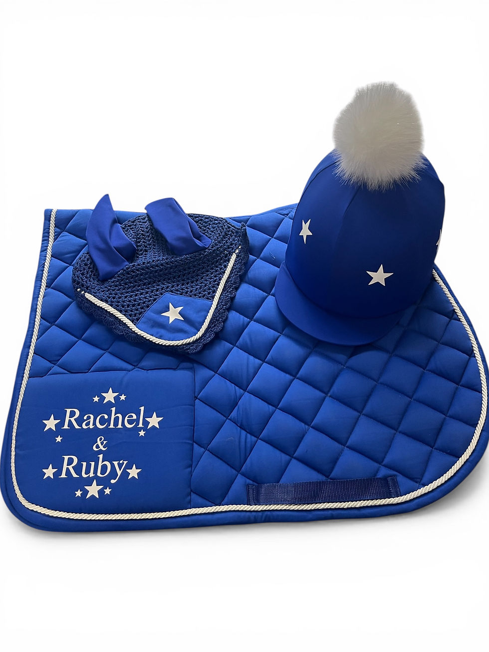 Royal Blue Marble Effect Saddle Pad Set with Matching Fly Veil & Hat Silk
